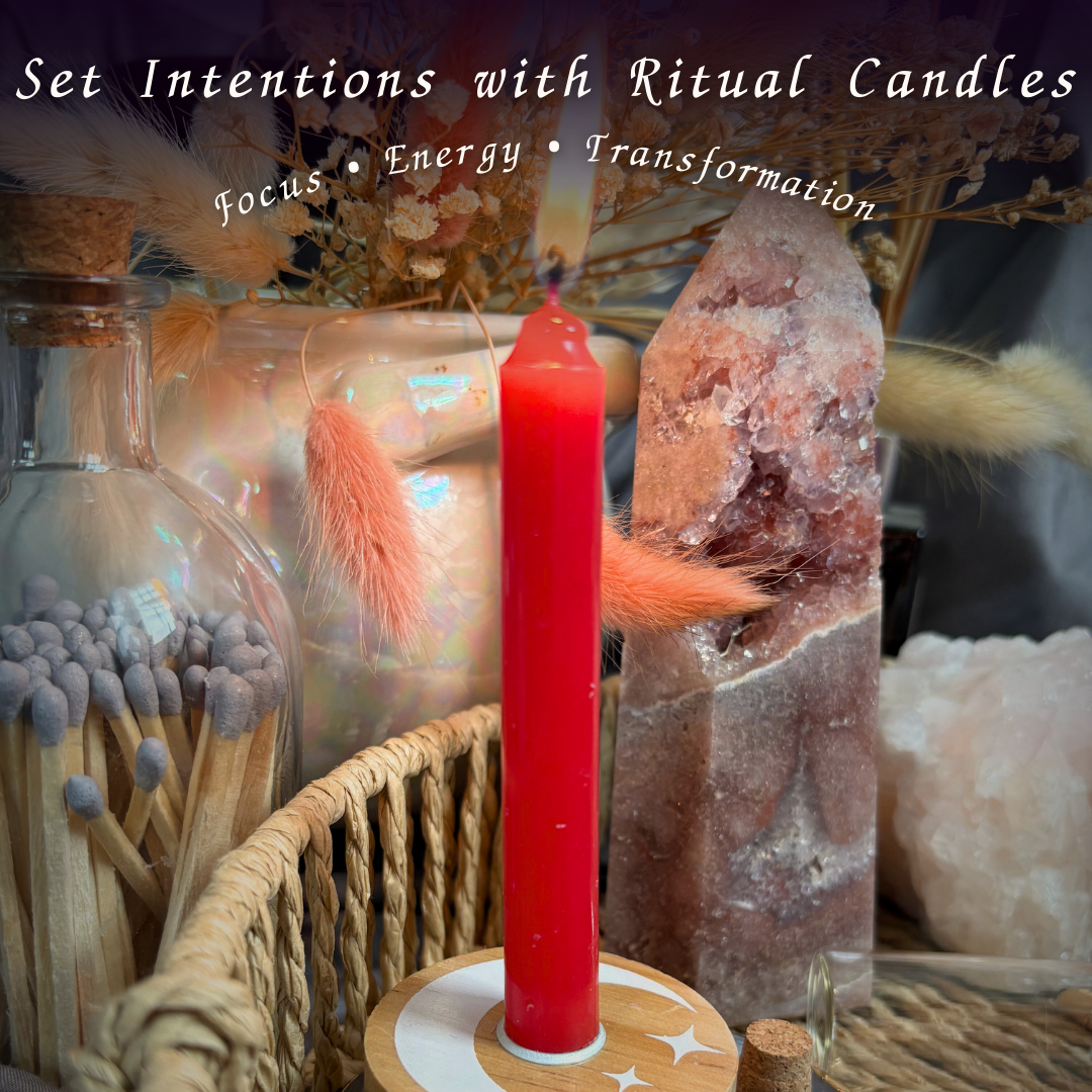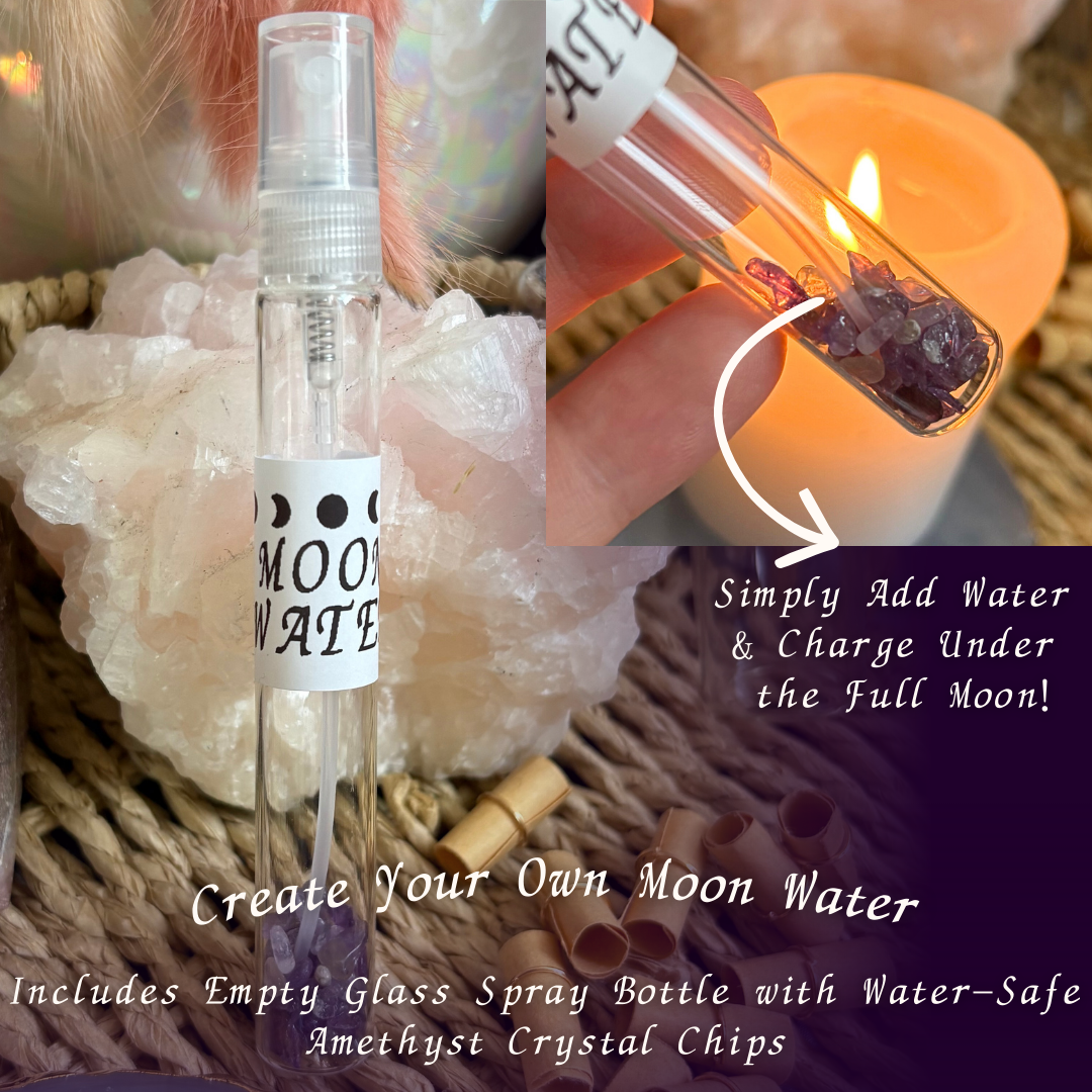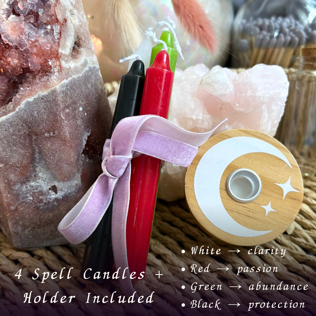 The set also includes coloured spell candles (white, red, green, and black spell candles), a candle holder, glass spell jars, salts, palo santo, and a moon water spray bottle with water-safe crystals — offering everything needed to begin or expand your practice with confidence.
