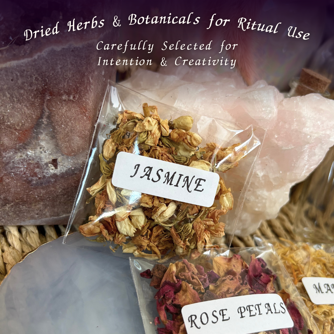 Inside the tin, you’ll find a carefully selected range of witchcraft herbs, including jasmine flower, rose petals, rosemary, mugwort, yarrow, and more — ideal for spell jars, ritual work, altar offerings, and crafting your own blends. Paired with healing crystals and crystal chips for spell jars such as amethyst, citrine, and carnelian, this kit allows you to explore energy work and intention setting in a personal and meaningful way.